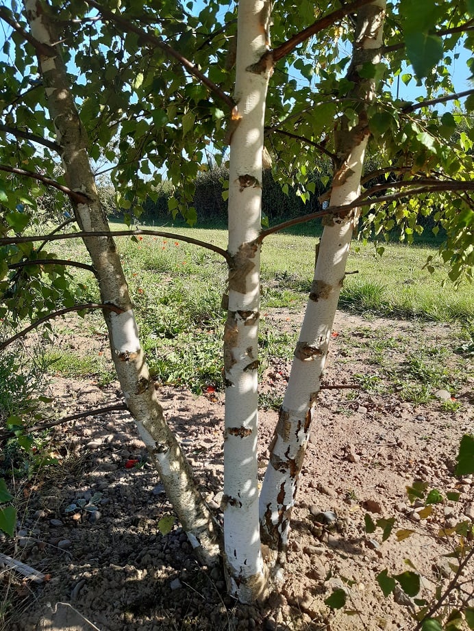 Because it is a cultivar of the native Betula, the usual black, dark fissures that crack and run from the base of the trunk contrast wonderfully against its snowy bark.
